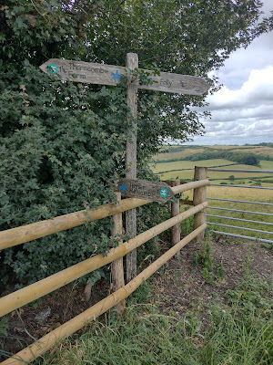 A enormous field on our left offered fantastic unobscured views over to Hardy's Monument way distant on the horizon. The farmer was urgently bringing in baled straw before more rain fell. With that rain the landscape was cooled, subdued, lank, and with harvest well under way it felt more autumnal than July.